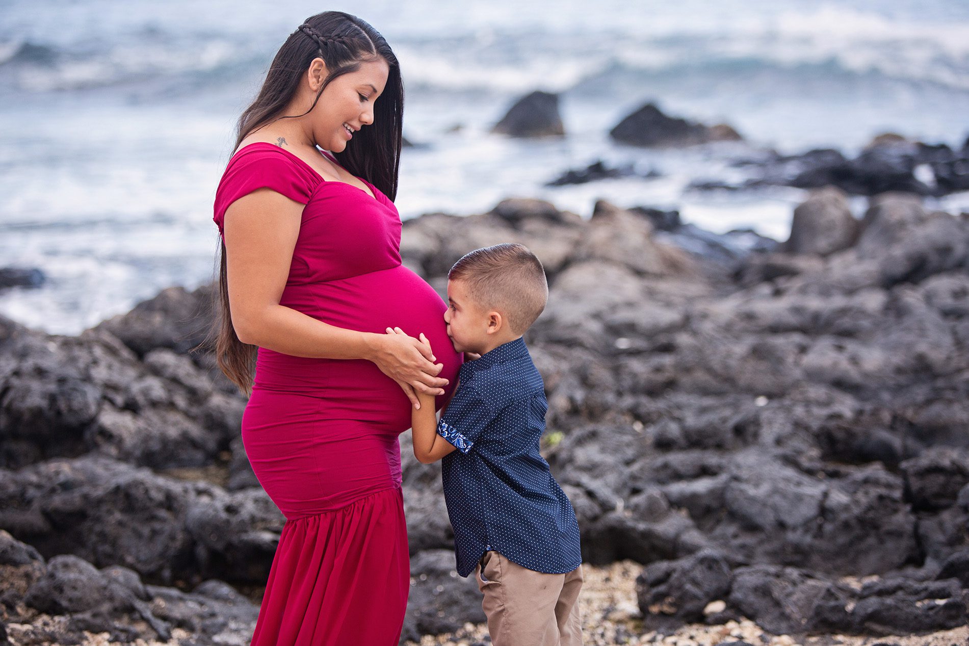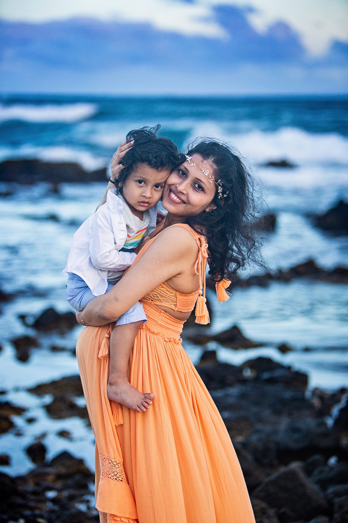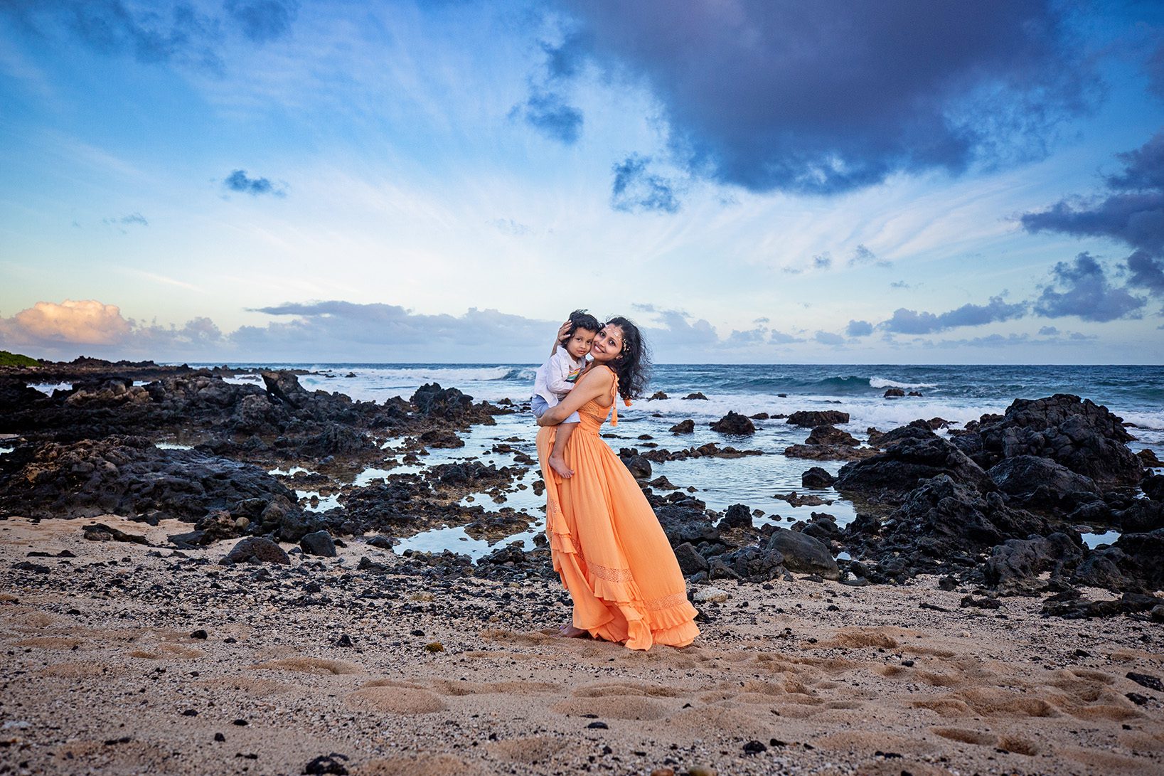 Wawamalu Beach is a bit of gorgeous rocky coastline just down the way from Sandy Beach Park. It’s rocky shore make shoes necessary but the sunlit mountain backgrounds and lava rock dotted water are worth the extra effort. It is located about a 35 minute drive from Waikiki. It is a good location for an afternoon photo session. While the sun sets behind the mountain and it often gets pretty light reflecting back into the clouds. Great for couples, sometimes families with young children will do better on the sandy side of the beach so we may split our time between the two walkable locations.